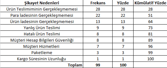 Yukarıdaki görseldeki gibi çizimimizi yaparız. Burada çizdiğimiz dikey kırmızı çizginin solunda kalan şikâyet nedenleri, şikâyetlerin ana nedenlerini oluşturmakta ve öncelikle ilgilenilmesi gereken şikâyetlerdir. Bu şikâyetler:
